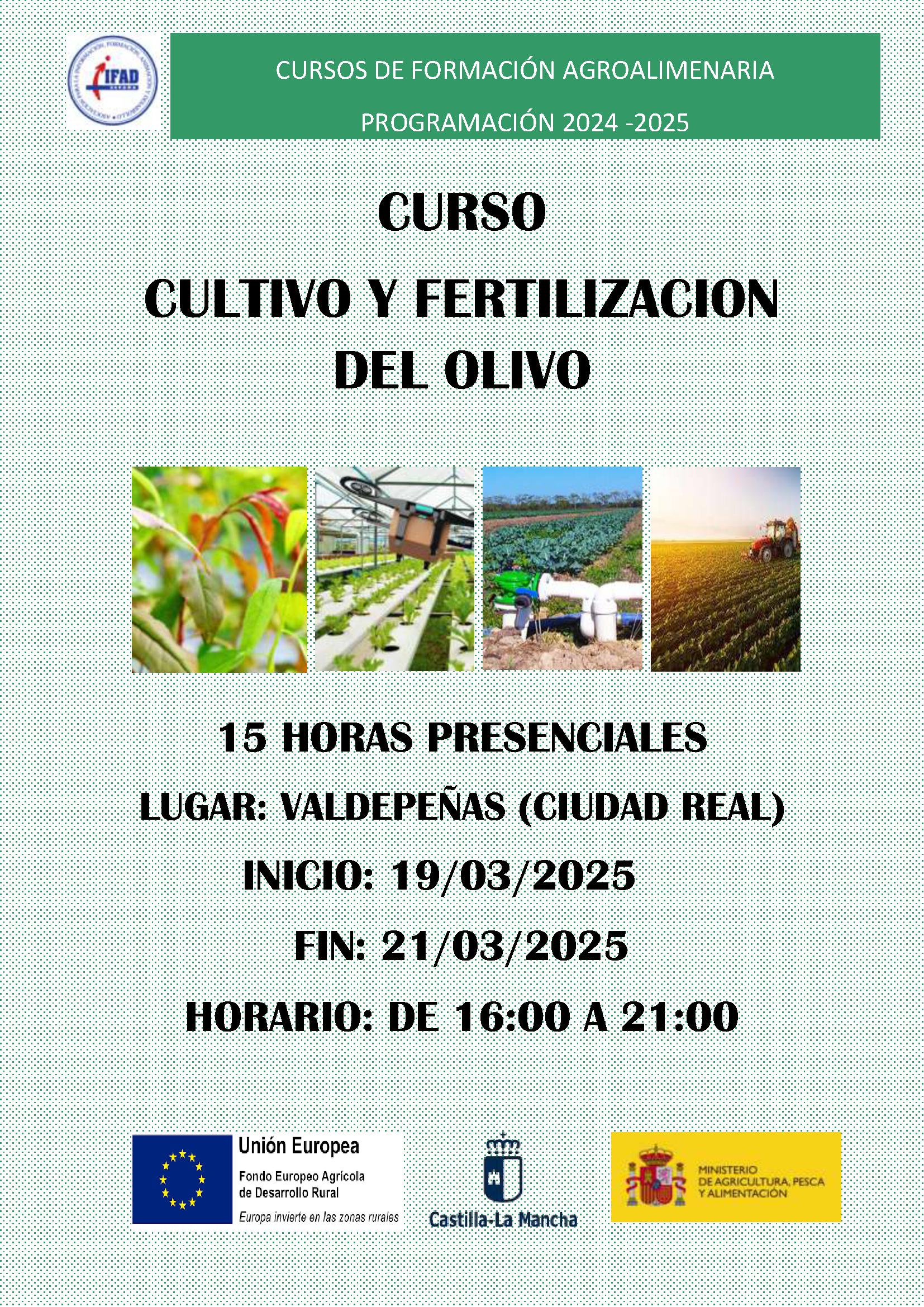 La localidad de Valdepeñas acogerá un curso de cultivo y fertilización del olivo, dentro de la programación de formación agroalimentaria 2024-2025. El curso, de 15 horas presenciales, se desarrollará del 19 al 21 de marzo de 2025, en horario de 16:00 a 21:00 horas.