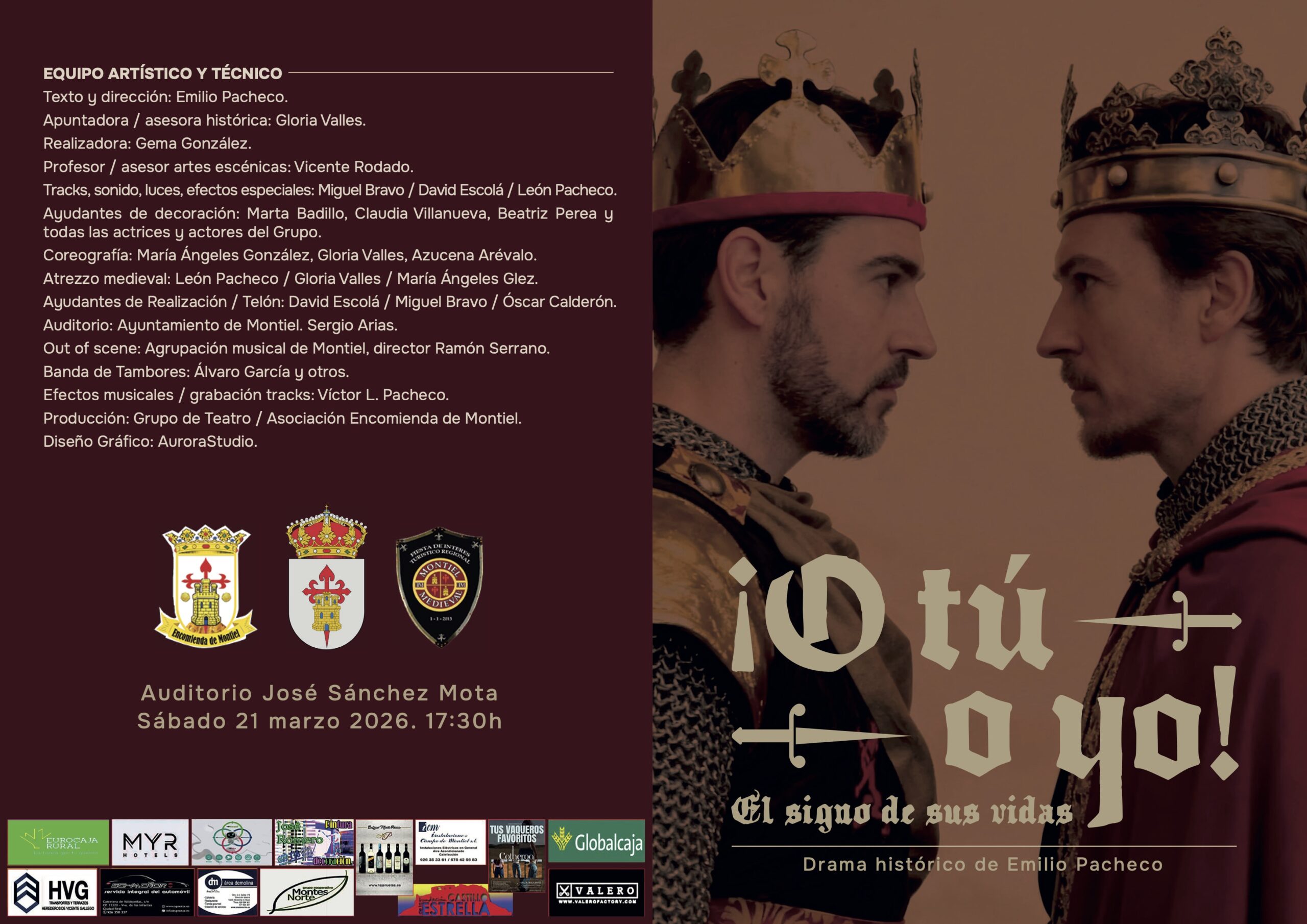 El Auditorio José Sánchez Mota será el escenario este sábado 21 de marzo, a las 17:30 horas, del estreno de “O tú o yo”, un drama histórico dirigido y escrito por Emilio Pacheco, bajo la producción del Grupo de Teatro Asociación Encomienda de Montiel. La puesta en escena propone una reconstrucción teatral de uno de los episodios más intensos y decisivos de la historia medieval castellana.