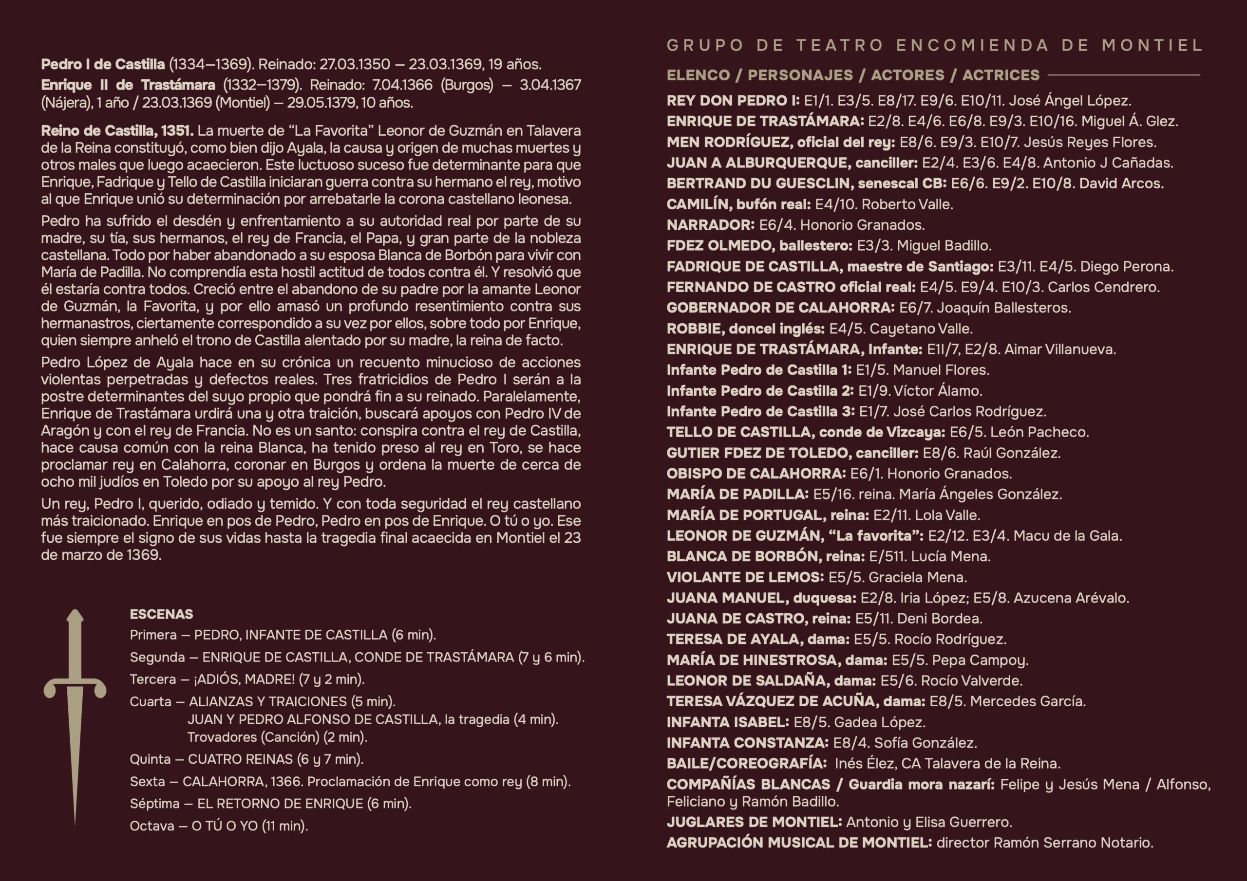 El montaje destaca por su enfoque integral, combinando interpretación dramática con elementos musicales, coreográficos y efectos escénicos. El elenco, encabezado por José Ángel López en el papel de Pedro I y Miguel Ángel González como Enrique de Trastámara, da vida a una amplia galería de personajes históricos que reflejan la complejidad del periodo. La producción incorpora además la participación de la Agrupación Musical de Montiel y una banda de tambores, reforzando la ambientación de época.