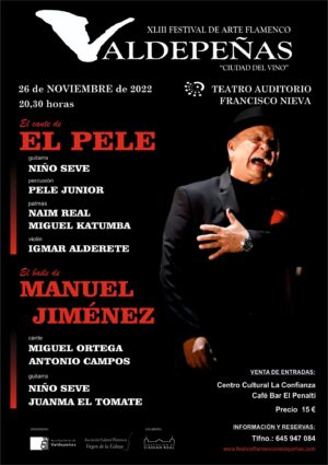 El Teatro-Auditorio Francisco Nieva de Valdepeñas volverá a acoger una nueva edición del Festival de Arte Flamenco de Valdepeñas el próximo sábado 26 de noviembre a las 20,30 horas. El Pele, una de las voces más importantes del panorama flamenco de las últimas décadas, y el joven y destacado bailaor Manuel Jiménez, serán los protagonistas de la cuadragésimo tercera edición de este histórico evento organizado por la Asociación Cultural Flamenca Virgen de la Cabeza y el Ayuntamiento de Valdepeñas con la colaboración de la Diputación Provincial de Ciudad Real.