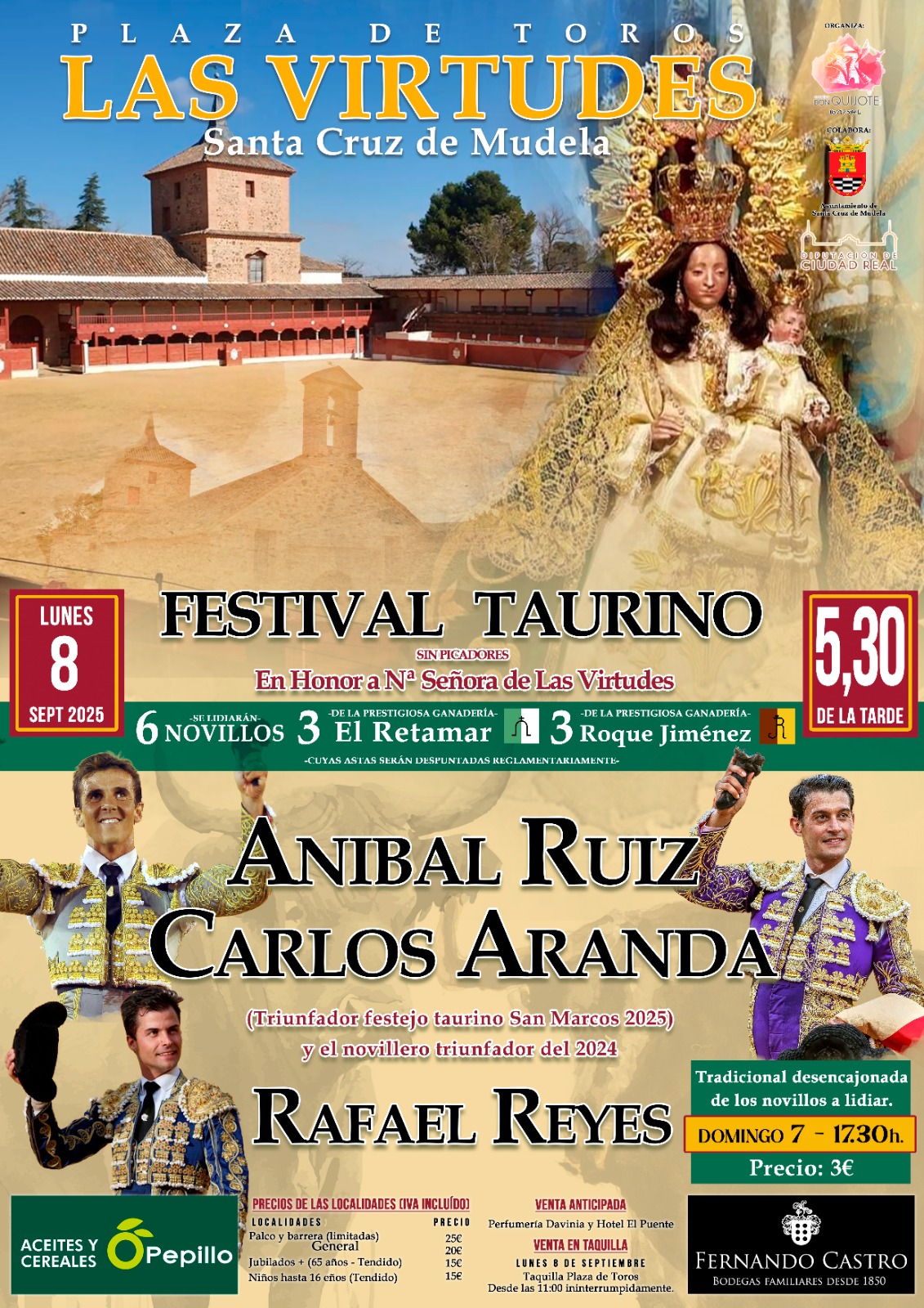 La Plaza de Toros de Las Virtudes acogerá el próximo lunes 8 de septiembre un festival taurino en honor a Nuestra Señora de las Virtudes, dentro de las celebraciones patronales de Santa Cruz de Mudela. El festejo, que dará comienzo a las 17:30 horas, reunirá a destacados nombres del ámbito taurino regional.