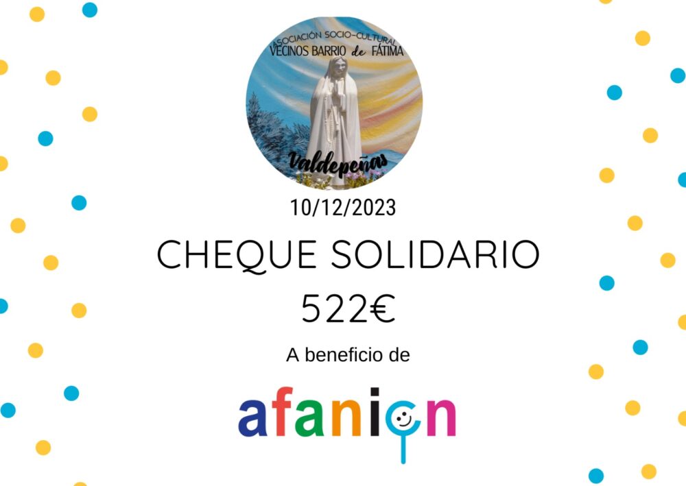 AFANION recibe el cheque solidario de parte de la Asociación de Vecinos del Barrio de Fátima de Valdepeñas.