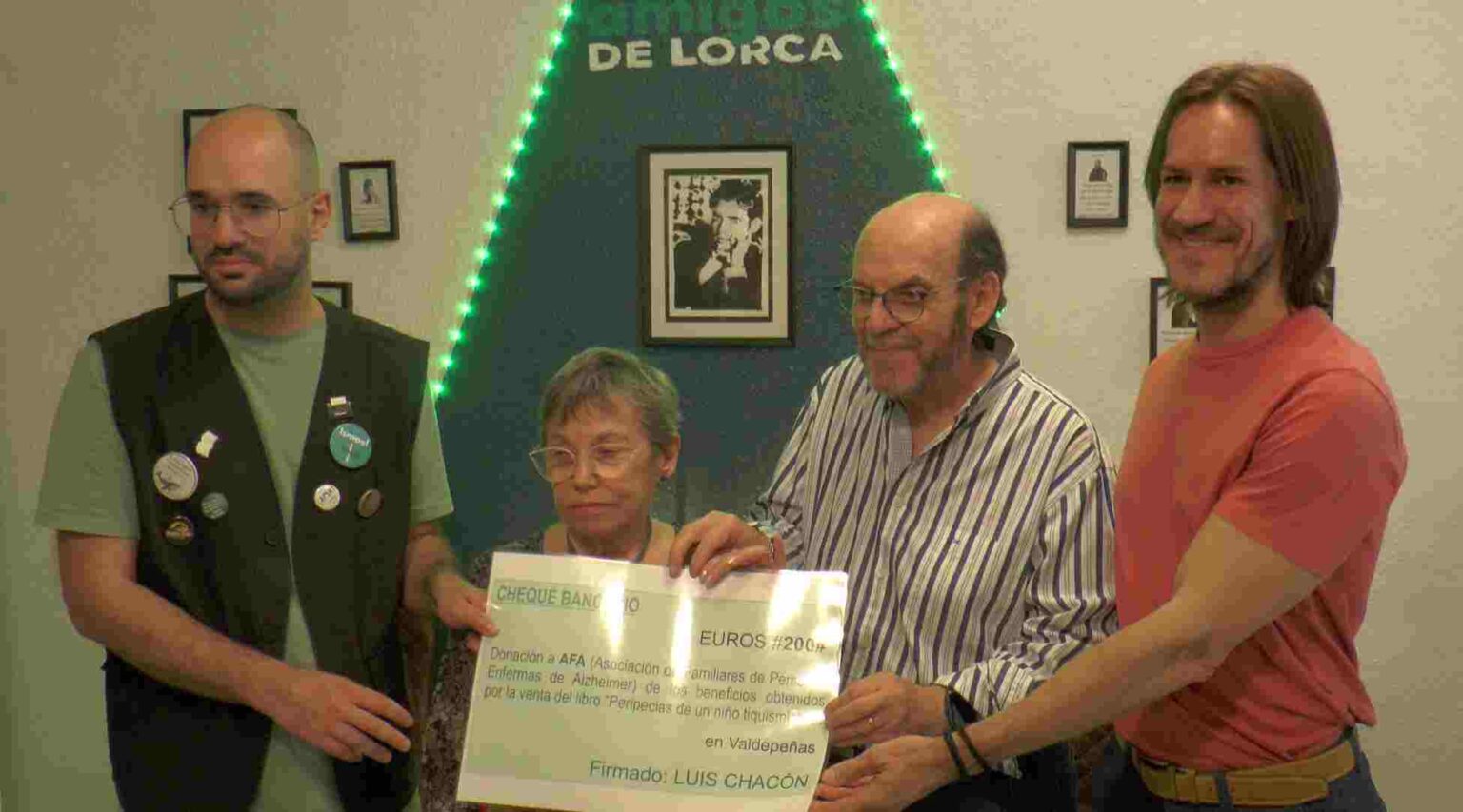 Luis Chacón, autor del libro ‘Peripecias de un niño tiquismiquis 1’ entregó ayer jueves 200 euros recaudados por la venta del libro a la Asociación de Familiares de Personas con Enfermedad de Alzheimer y Otras Demencias (AFA) Valdepeñas.