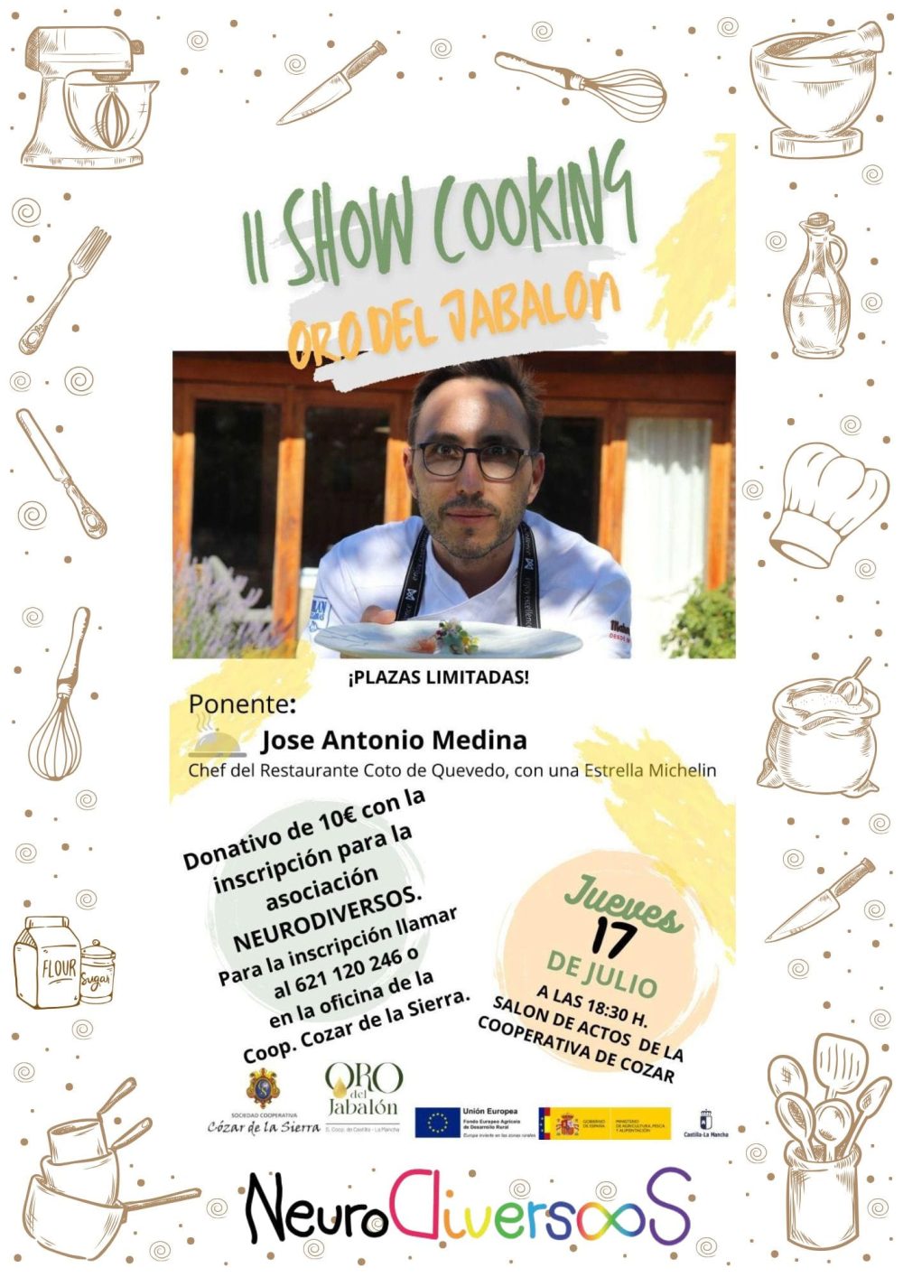 La siguiente actividad será el II Show Cooking Oro del Jabalón de Cózar, organizado por Oro del Jabalón y la Cooperativa Cózar de la Sierra, que tendrá lugar el jueves, 17 de julio a las 18:30 horas y que se realizará a beneficio de Neurodiversos C-LM.